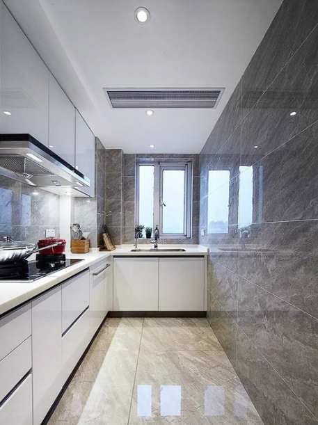 厨房的颜色和地上的颜色应该和这个家居的颜色相配合。厨房的颜色可以用白色和浅黄色的比较好。厨房里面颜色禁止用红色,红色会使人心里感到急躁,起反向的作用。比如厨房墙壁用白色和乳黄色的,不管是什么样的橱柜搭配起来都比较好;地面用淡黄色和乳白色的砖搭配起来比较好。灶台可以用黑色的,也可以用乳白色的。因为厨房是一个干净的地方,需要光亮,和整个墙壁搭配起来它要亮。因为只有白色的和乳黄色的会让人感觉到干净、舒服。